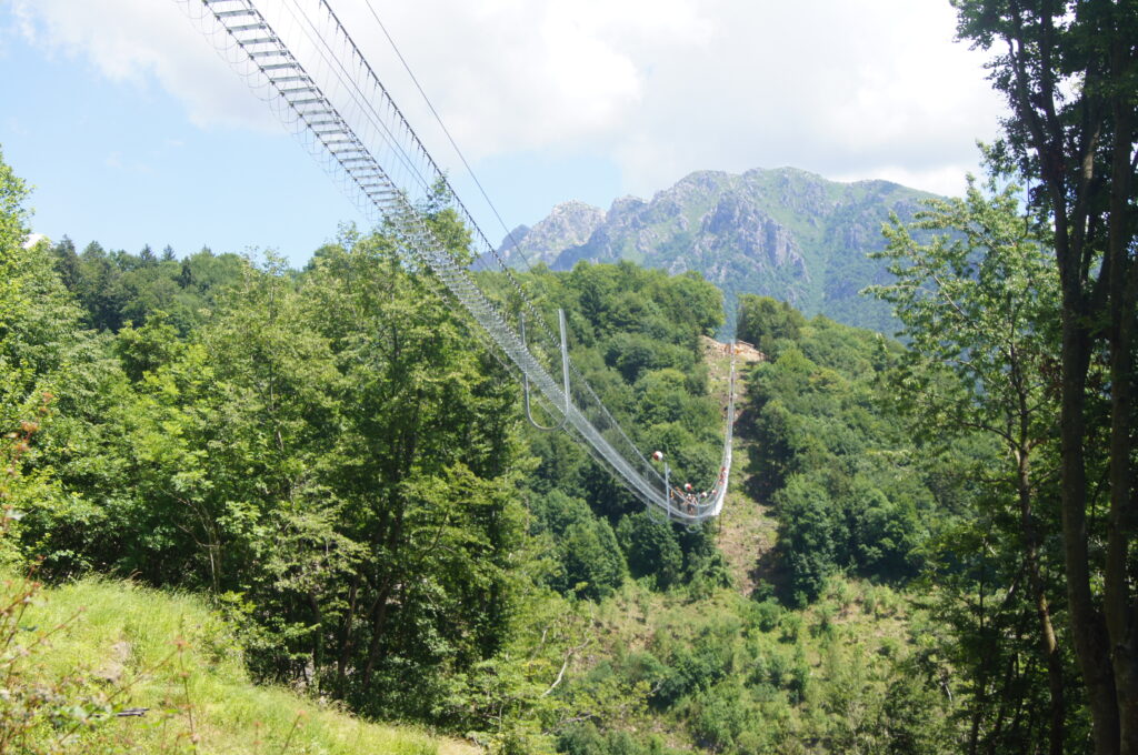 Dossena is home to one of the longest Tibetan bridges in the world, offering spectacular views of the Orobie landscape.